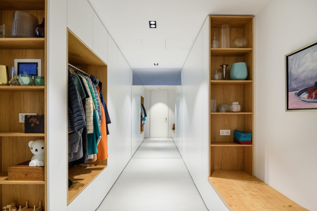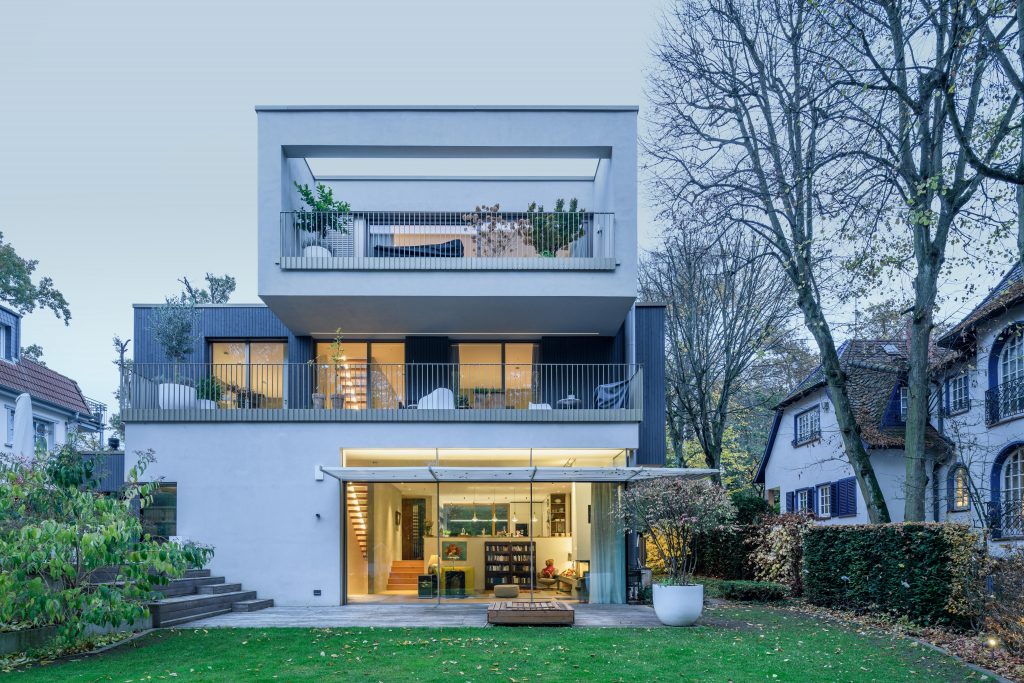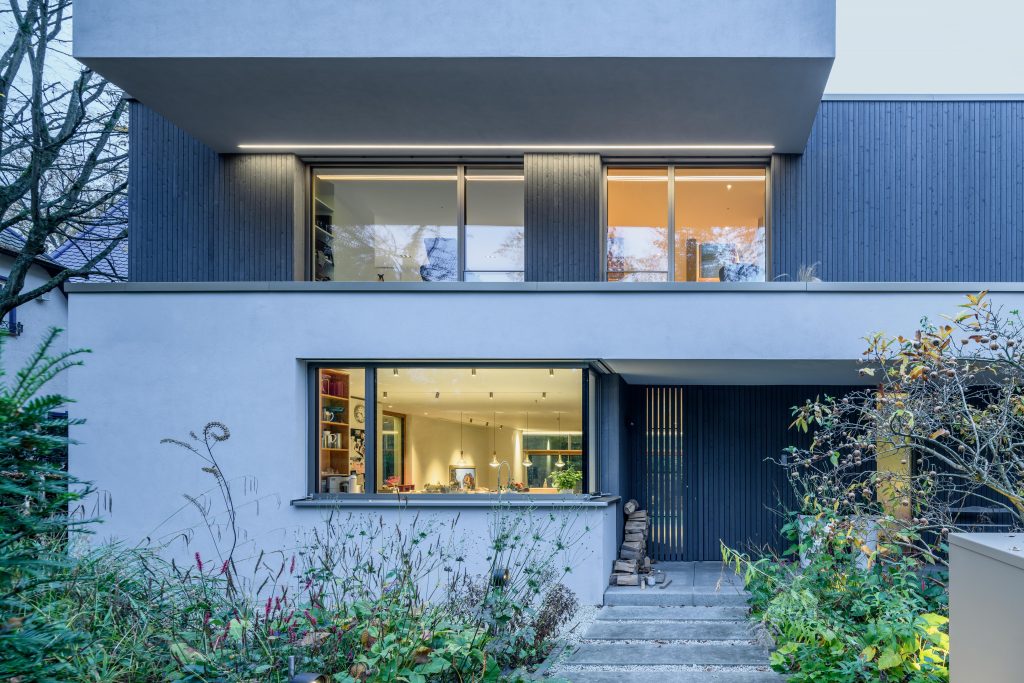 Die äußere Gestaltung des Hauses wird durch eine raffinierte Gliederung der Baumasse geprägt, die durch den etagenweisen Versatz und einen bewussten Wechsel der Materialität – von warmem Holz zu klaren Putzflächen – betont wird. Dieser architektonische Ansatz ermöglicht zudem die Ausbildung von großzügigen Terrassenflächen und begrünten Dächern, die das Haus nicht nur funktional, sondern auch ästhetisch bereichern.