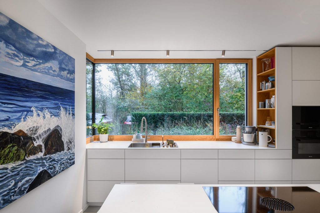 Ein markanter Geländesprung von etwa einem Meter zwischen der Straßenseite und dem tiefer liegenden Gartenbereich wurde geschickt in die Architektur des Hauses integriert. Dadurch entstand im Inneren eine angenehme Raumhöhe im Wohnbereich sowie ein ebener Übergang in den Außenraum. Dieser fließende Übergang ermöglicht den Bewohnern, den Blick auf den prachtvollen Garten mit seinem wertvollen Baumbestand zu genießen, während das Gebäude eine ideale Verbindung von Innen- und Außenraum herstellt.