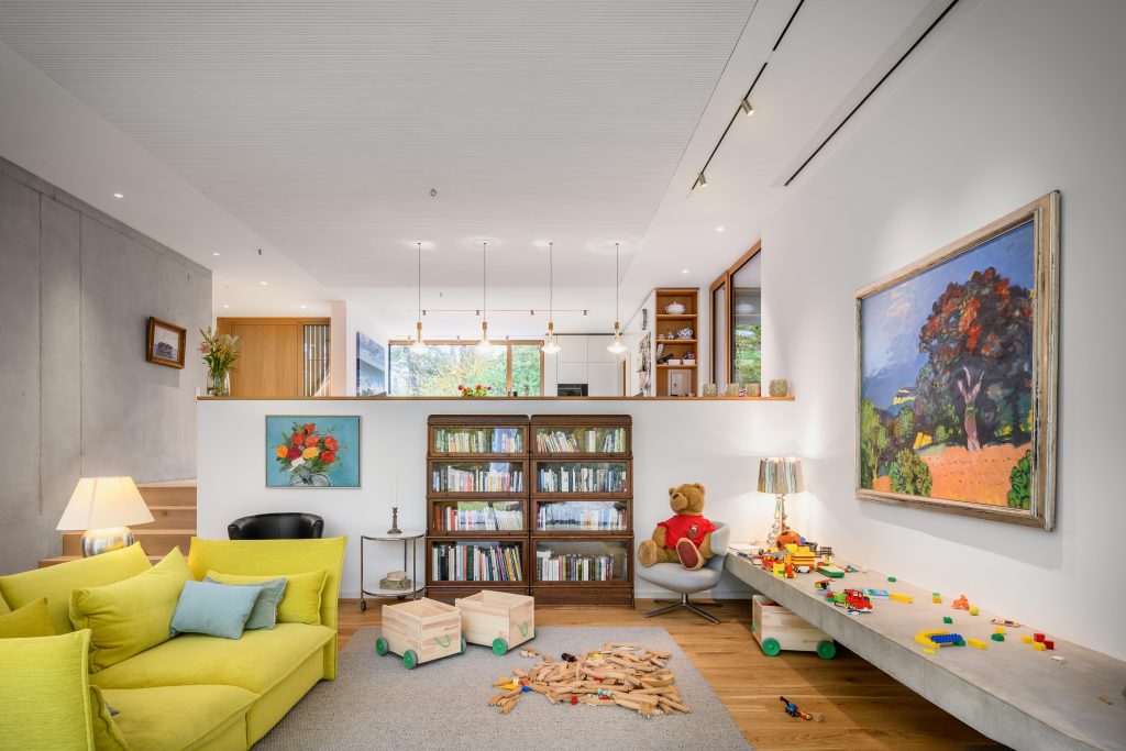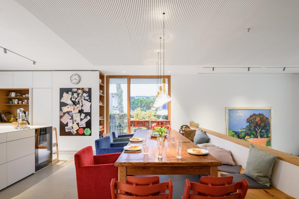 Anstelle eines in die Jahre gekommenen Bestandsgebäudes aus den späten 1950er-Jahren, das durch seinen hohen Sockel und eine strikte Trennung vom idyllischen Garten mit altem Baumbestand geprägt war, wurde ein modernes und einladendes Zuhause für eine sportliche vierköpfige Familie geschaffen.