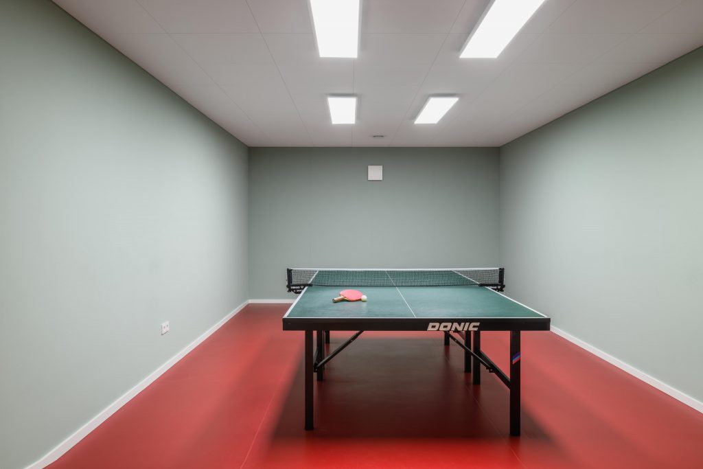 Das umfangreiche Raumprogramm des Hauses wurde auf zwei Vollgeschosse und ein zurückgesetztes Staffelgeschoss verteilt. Zusätzlich ist das Gebäude vollständig unterkellert, wodurch Platz für diverse Funktionsräume geschaffen wurde. Im Untergeschoss befinden sich neben Hauswirtschaftsräumen ein großzügiger Gastbereich mit eigenem Zugang sowie ein Tischtennis-Trainingsraum, der den sportlichen Charakter der Familie unterstreicht.