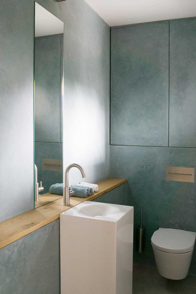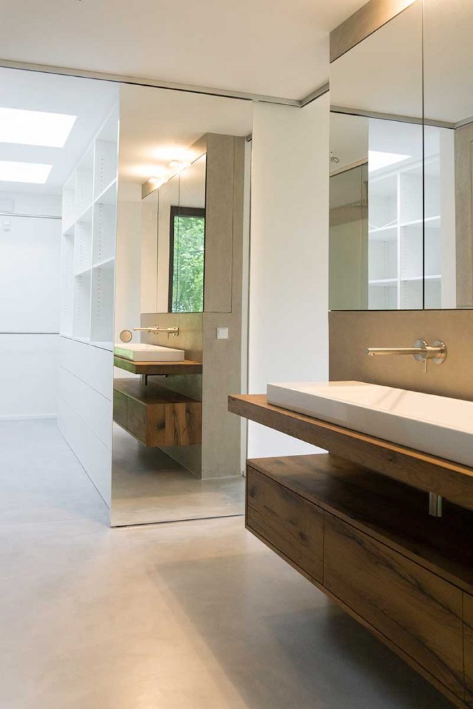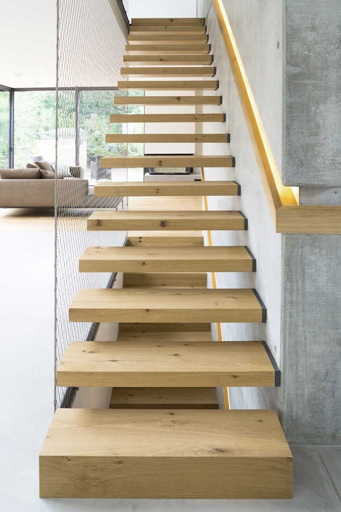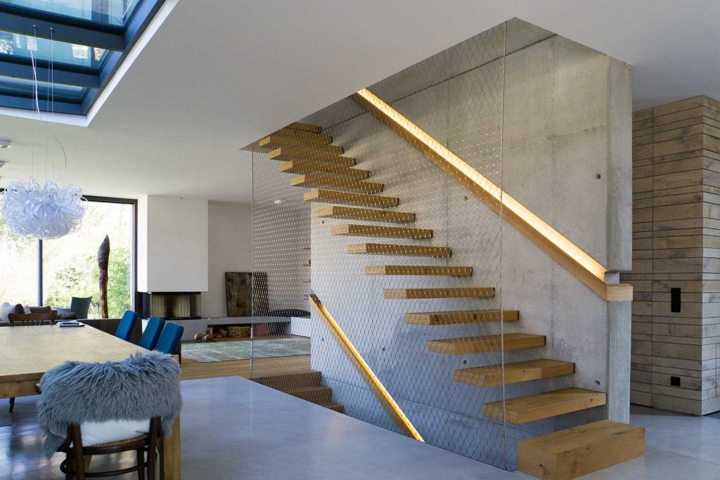 Eine Besonderheit stellt der mittige Einschnitt im Obergeschoss Richtung Westen dar, der zum einen Tageslicht im sehr tiefen Innenraum in Erd- und Obergeschoss bietet und zum anderen Raum für die freihängende Stahltreppe zur Dachterrasse schafft. Sämtliche Einbauten sowie Außenanlagen wurden mit geplant und realisiert. Das Haus verfügt über eine hocheffizient Gebäudehülle und Haustechnik.