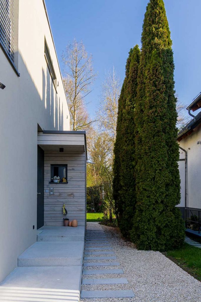 Die Herausforderung bestand in den nicht sehr großen Spielräumen sowie der Ausrichtung des Grundstücks nach Norden. Der Bebauungsplan schrieb die Lage auf dem Grundstück vor, einschließlich der Garage, und ermöglichte eine Erweiterung lediglich in Richtung Garten.