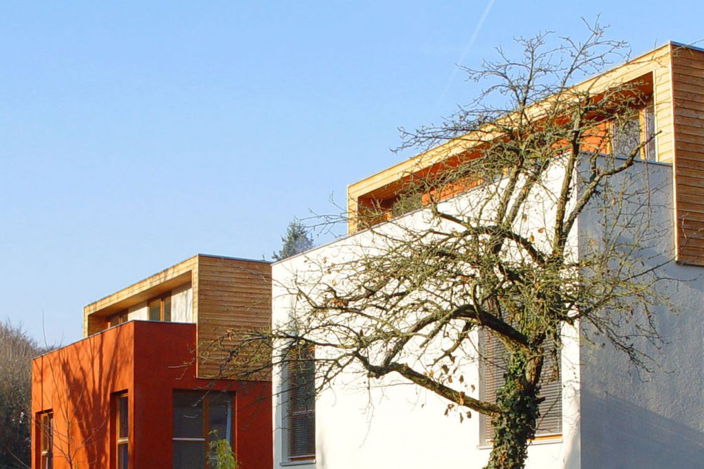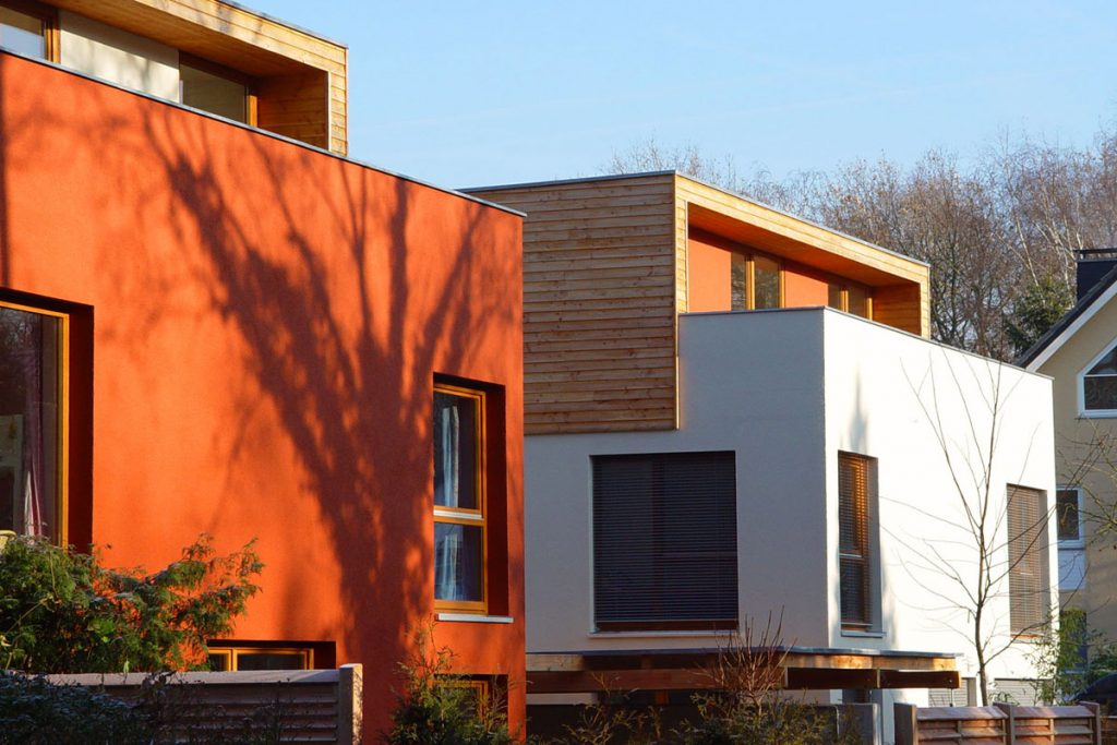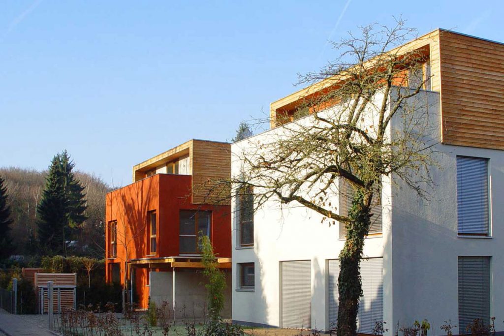 Auf einem Restgrundstück am Waldrand in der Nähe von Frankfurt wurden mit einem Bauträger zwei Einfamilienhäuser entwickelt.