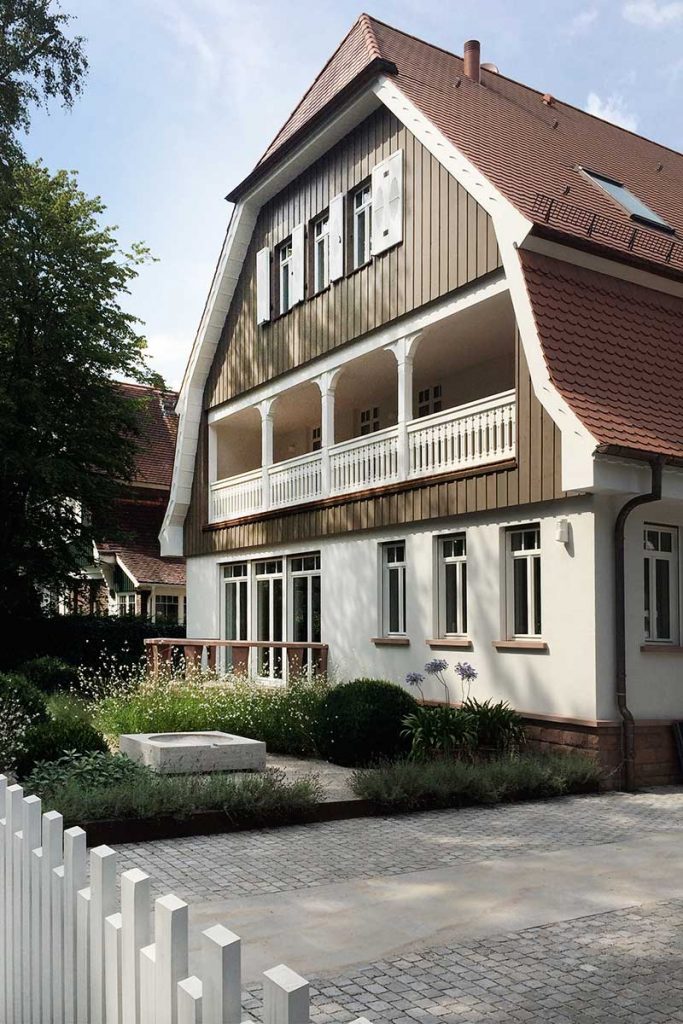 Nach gründlicher Recherche des dort vorherrschenden Jugendstils eigener Prägung, wurde ein Wohnhaus in Größe, Konstruktion und Anmutung entwickelt und realisiert, welches sich harmonisch in diese Umgebung einfügt. Auf einem massiven Keller und erhöhtem Erdgeschoss, erhebt sich ein Mansardegeschoss mit mächtigem Dachstuhl, gemäß seiner historischen Nachbarn und komplett in Holzbauweise erstellt. Typische Gestaltungsmerkmale wie Loggien, überdachte Eingänge mit farbigem Holzwerk, Verschalung oder Natursteinsockel wurden eingefügt und handwerklich hergestellt.