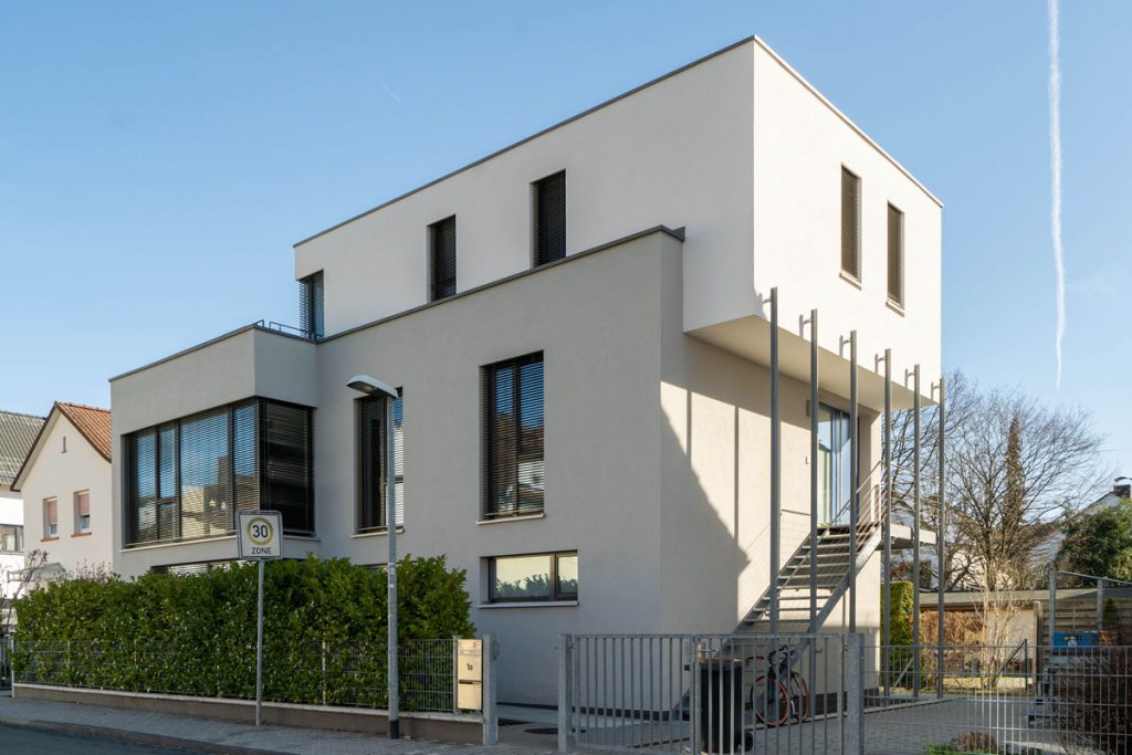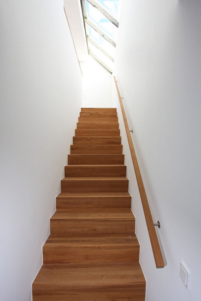 Es entstand ein voll unterkellertes Wohnhaus mit zwei Maisonette-Wohnungen. Die Erdgeschoss-Wohnung verfügt über einen zusätzlichen Schlafbereich im Untergeschoss, belichtet über einen bepflanzten Tiefhof. Das Obergeschoss ist über eine separate Außentreppe zugänglich und verfügt über eine interne Treppe in das Staffelgeschoss mit großer Dachterrasse. Die gezielte Zuordnung der Freibereiche beider Wohnungen ermöglicht ein Maximum an Privatsphäre, ebenso wie die Trennung der Eingangsbereiche.